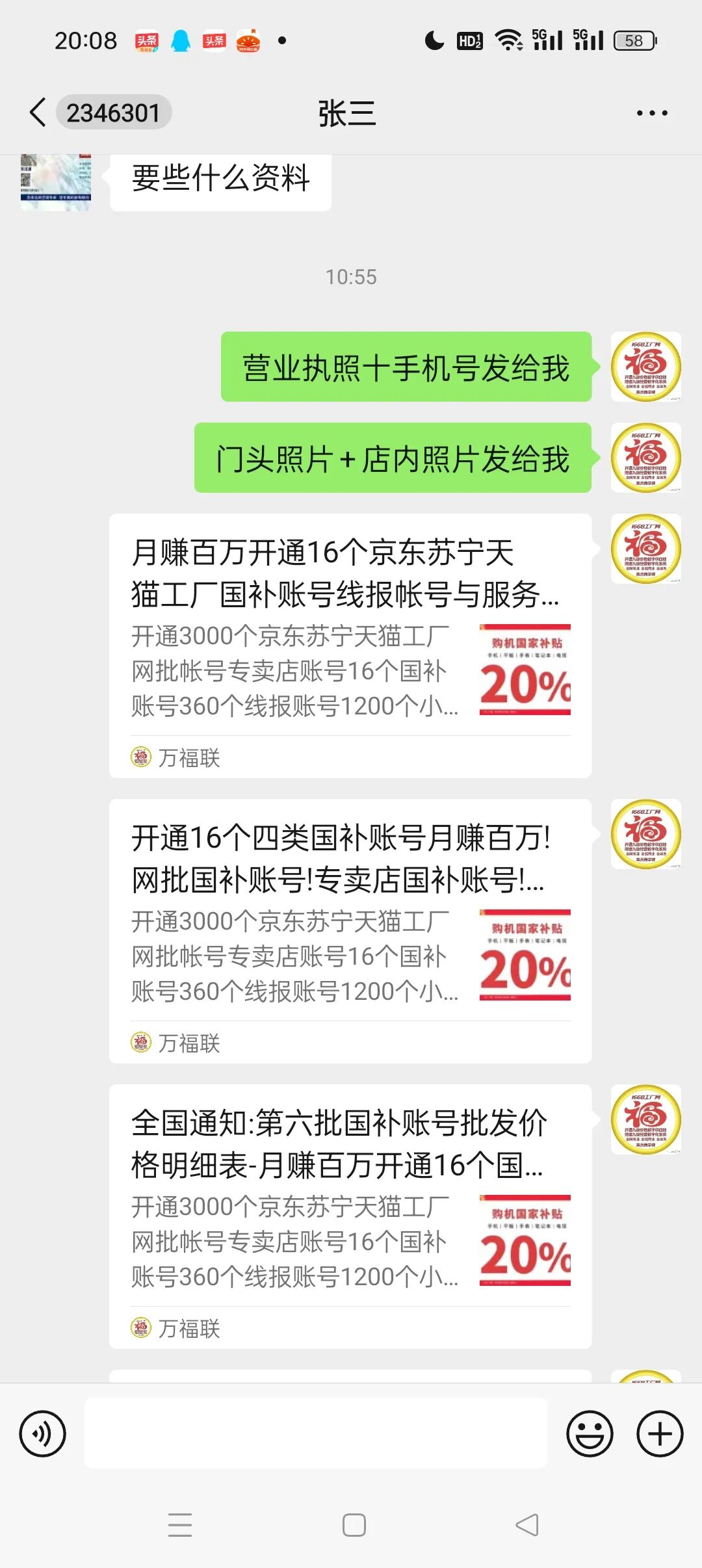 八个国补方式卖全国不垫资不核销不上传系统!让你月赚十万百万几百万!16个网批国补帐号,16个专卖店国补帐号,16个工厂国补帐号,16个线报国补帐号,75个令牌代理国补帐号,16个京东天猫店铺国补帐号,16个CPS佣金国补帐号,16个批发国补