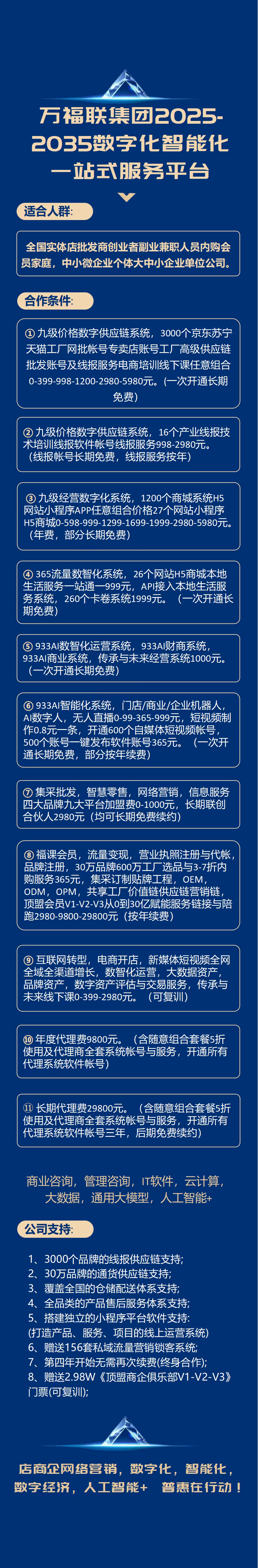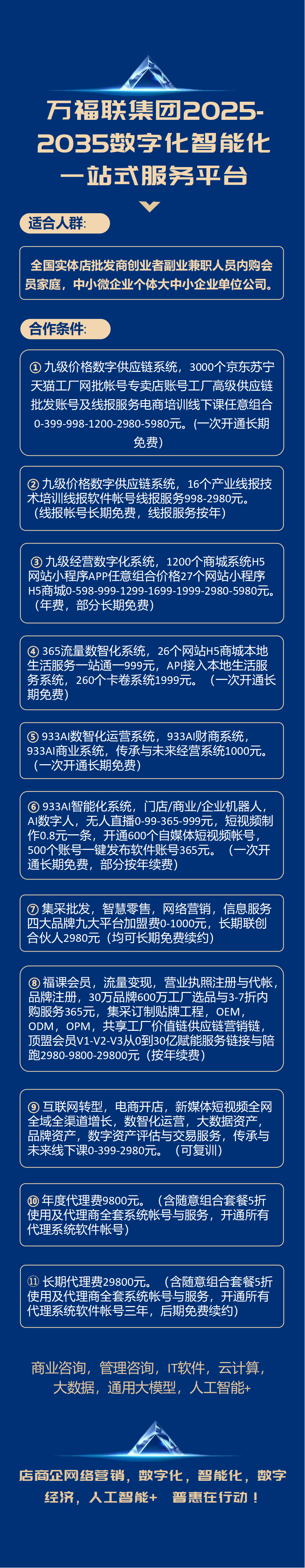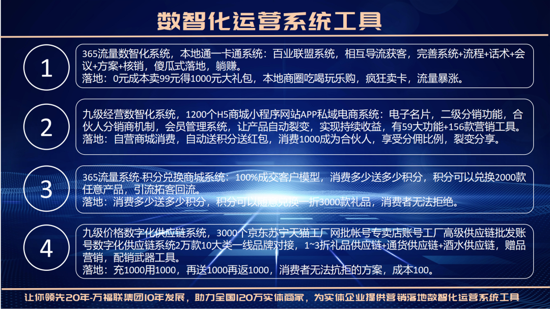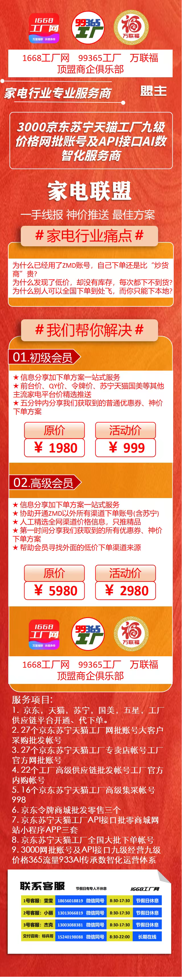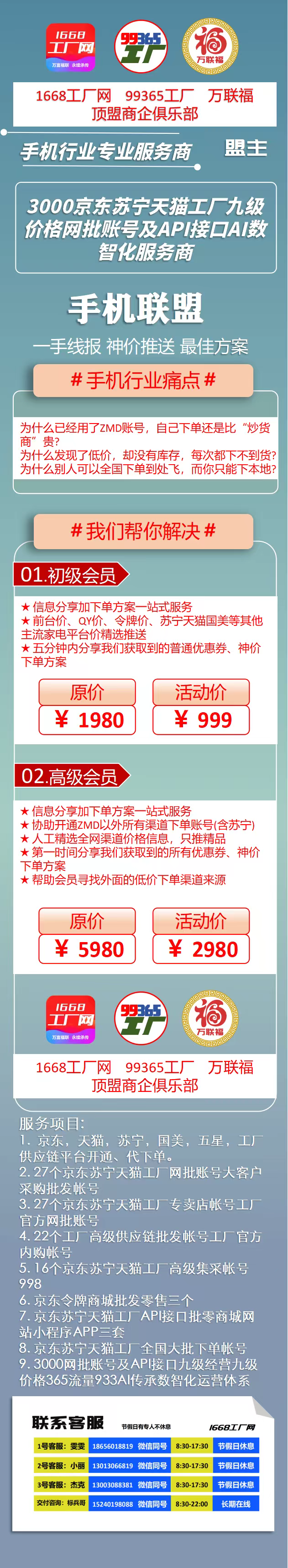 99元会员费开通3000个京东苏宁天猫工厂网批帐号专卖店账号16个国补账号360个线报账号1200个小程序商城H5商城系统365个流量系统156个AI数智化运营系统开通9级价格9级经营15个盈利模式!0投资年赚百千万,0资金年销三五亿!